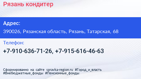Рязань-кондитер по адресу 390026, Рязанская область, Рязань, Татарская, 68 в дальнейшем Организация, размещена в следующих категориях: