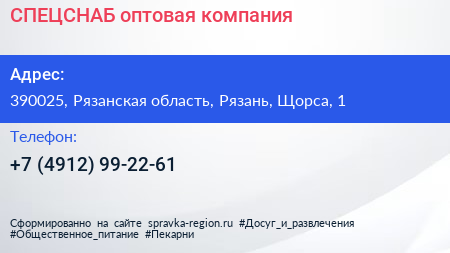 СПЕЦСНАБ, оптовая компания по адресу 390025, Рязанская область, Рязань, Щорса, 1 в дальнейшем Организация, размещена в следующих категориях: