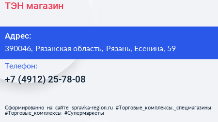 ТЭН, магазин по адресу 390046, Рязанская область, Рязань, Есенина, 59 в дальнейшем Организация, размещена в следующих категориях: