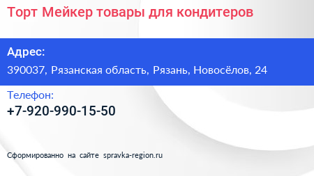 Торт-Мейкер, товары для кондитеров по адресу 390037, Рязанская область, Рязань, Новосёлов, 24 в дальнейшем Организация, размещена в следующих категориях: