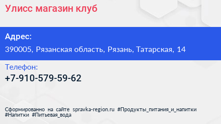 Улисс, магазин-клуб по адресу 390005, Рязанская область, Рязань, Татарская, 14 в дальнейшем Организация, размещена в следующих категориях: