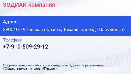 ЗОДИАК, компания по адресу 390010, Рязанская область, Рязань, проезд Шабулина, 6 в дальнейшем Организация, размещена в следующих категориях: