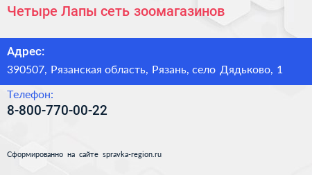 Четыре Лапы, сеть зоомагазинов по адресу 390507, Рязанская область, Рязань, село Дядьково, 1 в дальнейшем Организация, размещена в следующих категориях: