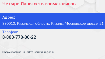 Четыре Лапы, сеть зоомагазинов по адресу 390013, Рязанская область, Рязань, Московское шоссе, 21 в дальнейшем Организация, размещена в следующих категориях: