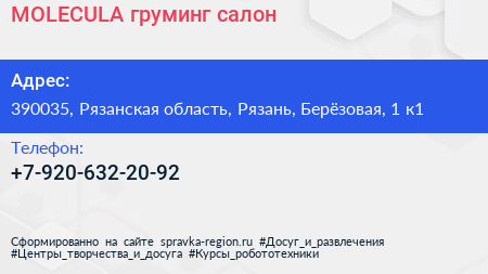 MOLECULA, груминг-салон по адресу 390035, Рязанская область, Рязань, Берёзовая, 1 к1 в дальнейшем Организация, размещена в следующих категориях: