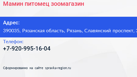 Мамин питомец, зоомагазин по адресу 390035, Рязанская область, Рязань, Славянский проспект, 3 в дальнейшем Организация, размещена в следующих категориях: