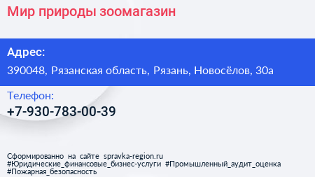 Мир природы, зоомагазин по адресу 390048, Рязанская область, Рязань, Новосёлов, 30а в дальнейшем Организация, размещена в следующих категориях: