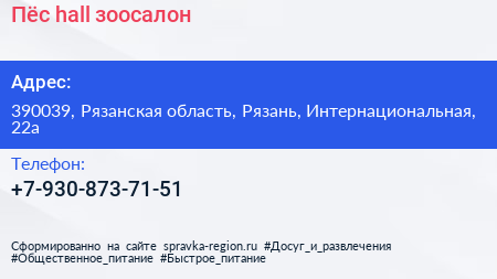 Пёс-hall, зоосалон по адресу 390039, Рязанская область, Рязань, Интернациональная, 22а в дальнейшем Организация, размещена в следующих категориях: