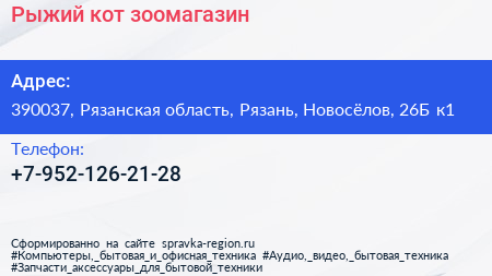 Рыжий кот, зоомагазин по адресу 390037, Рязанская область, Рязань, Новосёлов, 26Б к1 в дальнейшем Организация, размещена в следующих категориях: