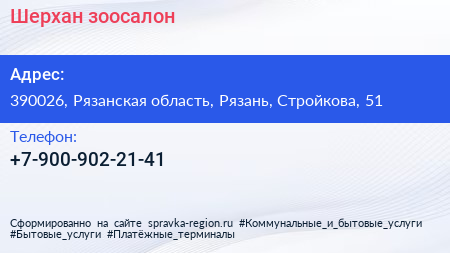 Шерхан, зоосалон по адресу 390026, Рязанская область, Рязань, Стройкова, 51 в дальнейшем Организация, размещена в следующих категориях: