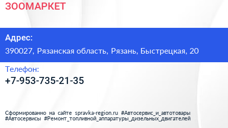 ЗООМАРКЕТ по адресу 390027, Рязанская область, Рязань, Быстрецкая, 20 в дальнейшем Организация, размещена в следующих категориях: