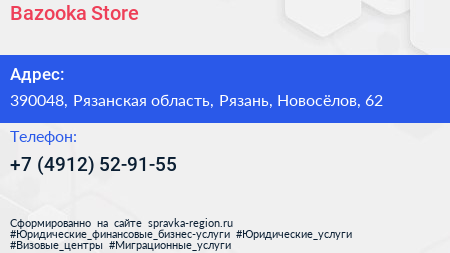 Bazooka Store по адресу 390048, Рязанская область, Рязань, Новосёлов, 62 в дальнейшем Организация, размещена в следующих категориях: