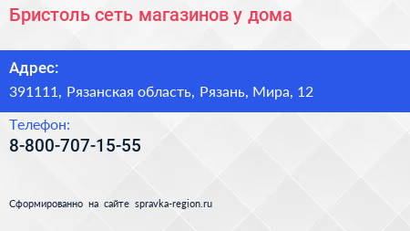 Бристоль, сеть магазинов у дома по адресу 391111, Рязанская область, Рязань, Мира, 12 в дальнейшем Организация, размещена в следующих категориях: