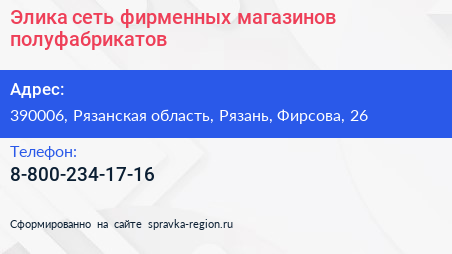 Элика, сеть фирменных магазинов полуфабрикатов по адресу 390006, Рязанская область, Рязань, Фирсова, 26 в дальнейшем Организация, размещена в следующих категориях: