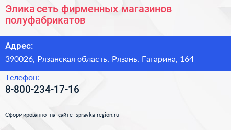 Элика, сеть фирменных магазинов полуфабрикатов по адресу 390026, Рязанская область, Рязань, Гагарина, 164 в дальнейшем Организация, размещена в следующих категориях: