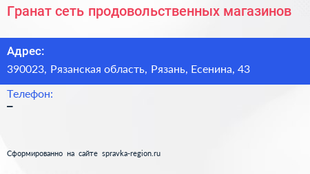 Гранат, сеть продовольственных магазинов по адресу 390023, Рязанская область, Рязань, Есенина, 43 в дальнейшем Организация, размещена в следующих категориях: