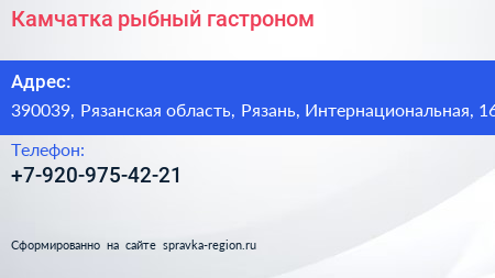 Камчатка, рыбный гастроном по адресу 390039, Рязанская область, Рязань, Интернациональная, 16 в дальнейшем Организация, размещена в следующих категориях: