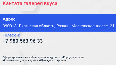 Кантата, галерея вкуса по адресу 390013, Рязанская область, Рязань, Московское шоссе, 21 в дальнейшем Организация, размещена в следующих категориях: