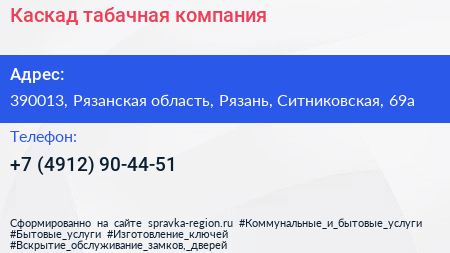 Каскад, табачная компания по адресу 390013, Рязанская область, Рязань, Ситниковская, 69а в дальнейшем Организация, размещена в следующих категориях:
