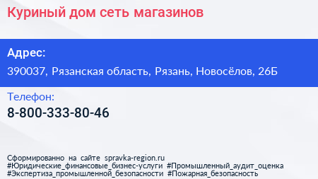 Куриный дом, сеть магазинов по адресу 390037, Рязанская область, Рязань, Новосёлов, 26Б в дальнейшем Организация, размещена в следующих категориях: