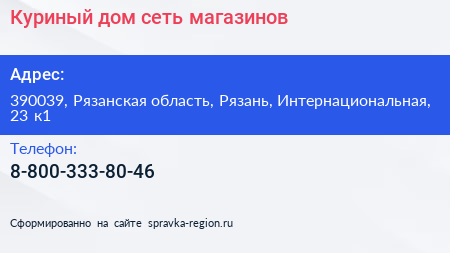 Куриный дом, сеть магазинов по адресу 390039, Рязанская область, Рязань, Интернациональная, 23 к1 в дальнейшем Организация, размещена в следующих категориях: