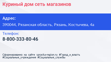 Куриный дом, сеть магазинов по адресу 390044, Рязанская область, Рязань, Костычева, 4а в дальнейшем Организация, размещена в следующих категориях: