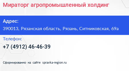 Мираторг, агропромышленный холдинг по адресу 390013, Рязанская область, Рязань, Ситниковская, 69а в дальнейшем Организация, размещена в следующих категориях: