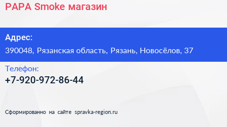 PAPA Smoke, магазин по адресу 390048, Рязанская область, Рязань, Новосёлов, 37 в дальнейшем Организация, размещена в следующих категориях: