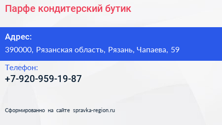 Парфе, кондитерский бутик по адресу 390000, Рязанская область, Рязань, Чапаева, 59 в дальнейшем Организация, размещена в следующих категориях: