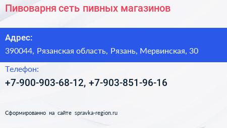 Пивоварня, сеть пивных магазинов по адресу 390044, Рязанская область, Рязань, Мервинская, 30 в дальнейшем Организация, размещена в следующих категориях: