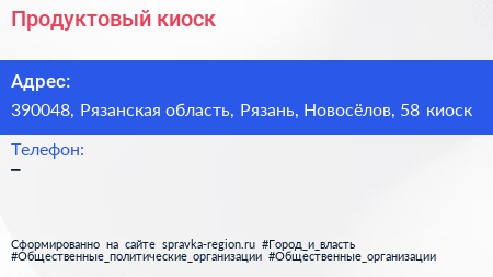 Продуктовый киоск по адресу 390048, Рязанская область, Рязань, Новосёлов, 58 киоск в дальнейшем Организация, размещена в следующих категориях: