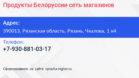 Продукты Белоруссии, сеть магазинов по адресу 390013, Рязанская область, Рязань, Чкалова, 1 к4 в дальнейшем Организация, размещена в следующих категориях: