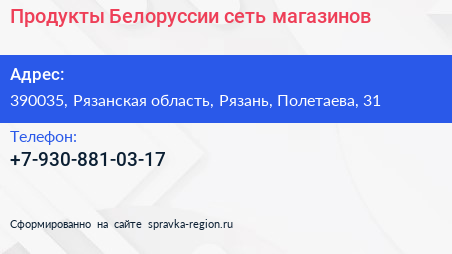 Продукты Белоруссии, сеть магазинов по адресу 390035, Рязанская область, Рязань, Полетаева, 31 в дальнейшем Организация, размещена в следующих категориях: