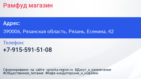 Рамфуд, магазин по адресу 390006, Рязанская область, Рязань, Есенина, 42 в дальнейшем Организация, размещена в следующих категориях: