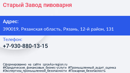 Старый Завод, пивоварня по адресу 390019, Рязанская область, Рязань, 12-й район, 131 в дальнейшем Организация, размещена в следующих категориях: