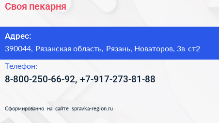 Своя пекарня по адресу 390044, Рязанская область, Рязань, Новаторов, 3в ст2 в дальнейшем Организация, размещена в следующих категориях: