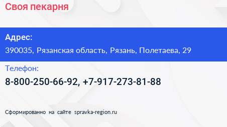 Своя пекарня по адресу 390035, Рязанская область, Рязань, Полетаева, 29 в дальнейшем Организация, размещена в следующих категориях: