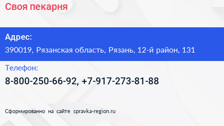 Своя пекарня по адресу 390019, Рязанская область, Рязань, 12-й район, 131 в дальнейшем Организация, размещена в следующих категориях: