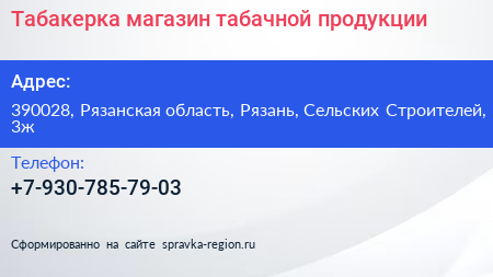 Табакерка, магазин табачной продукции по адресу 390028, Рязанская область, Рязань, Сельских Строителей, 3ж в дальнейшем Организация, размещена в следующих категориях: