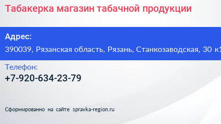 Табакерка, магазин табачной продукции по адресу 390039, Рязанская область, Рязань, Станкозаводская, 30 к1 в дальнейшем Организация, размещена в следующих категориях: