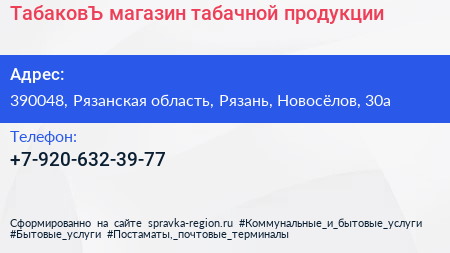 ТабаковЪ, магазин табачной продукции по адресу 390048, Рязанская область, Рязань, Новосёлов, 30а в дальнейшем Организация, размещена в следующих категориях: