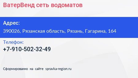ВатерВенд, сеть водоматов по адресу 390026, Рязанская область, Рязань, Гагарина, 164 в дальнейшем Организация, размещена в следующих категориях: