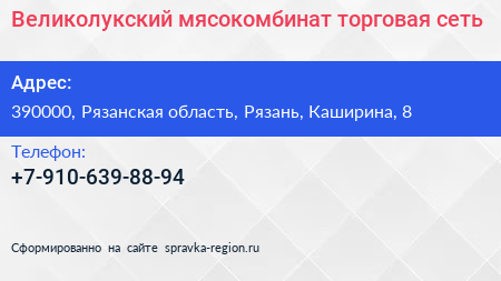 Великолукский мясокомбинат, торговая сеть по адресу 390000, Рязанская область, Рязань, Каширина, 8 в дальнейшем Организация, размещена в следующих категориях: