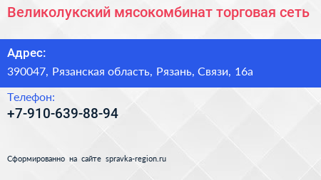 Великолукский мясокомбинат, торговая сеть по адресу 390047, Рязанская область, Рязань, Связи, 16а в дальнейшем Организация, размещена в следующих категориях: