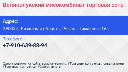 Великолукский мясокомбинат, торговая сеть по адресу 390037, Рязанская область, Рязань, Тимакова, 16а в дальнейшем Организация, размещена в следующих категориях: