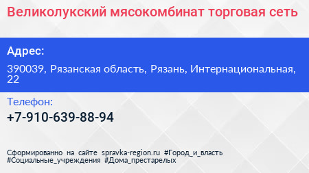 Великолукский мясокомбинат, торговая сеть по адресу 390039, Рязанская область, Рязань, Интернациональная, 22 в дальнейшем Организация, размещена в следующих категориях: