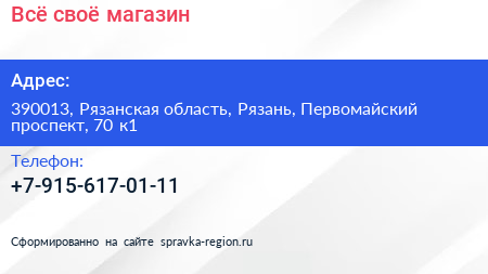 Всё своё, магазин по адресу 390013, Рязанская область, Рязань, Первомайский проспект, 70 к1 в дальнейшем Организация, размещена в следующих категориях: