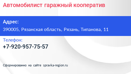Автомобилист, гаражный кооператив по адресу 390005, Рязанская область, Рязань, Типанова, 11 в дальнейшем Организация, размещена в следующих категориях: