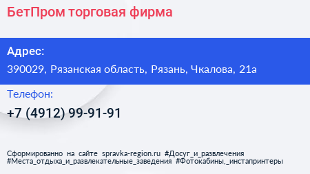 БетПром, торговая фирма по адресу 390029, Рязанская область, Рязань, Чкалова, 21а в дальнейшем Организация, размещена в следующих категориях: