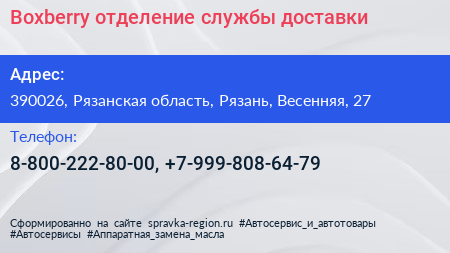 Boxberry, отделение службы доставки по адресу 390026, Рязанская область, Рязань, Весенняя, 27 в дальнейшем Организация, размещена в следующих категориях: